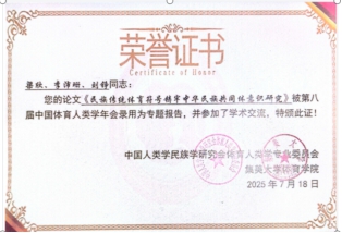 我院两名研究生在指导教师的指导下,历经选题、内容修订、投稿及大会遴选等多轮环节,投稿被大会录用并以专题报告形式进行了学术交流。其中,梁欣同学(刘铮教授指导)的《民族传统体育符号铸牢中华民族共同体意识研究》,系统阐释了民族传统体育符号作为文化载体在铸牢中华民族共同体意识中的独特价值与实现机制;张健飒同学(刘丽志博士指导)的《具身认知视域下高校体育铸牢中华民族共同体意识》,从具身认知理论出发,深入剖析高校体育教学实践中身体体验与文化认同的内在互动机制,为新时代体育教育促进民族团结工作提供了路径参考。